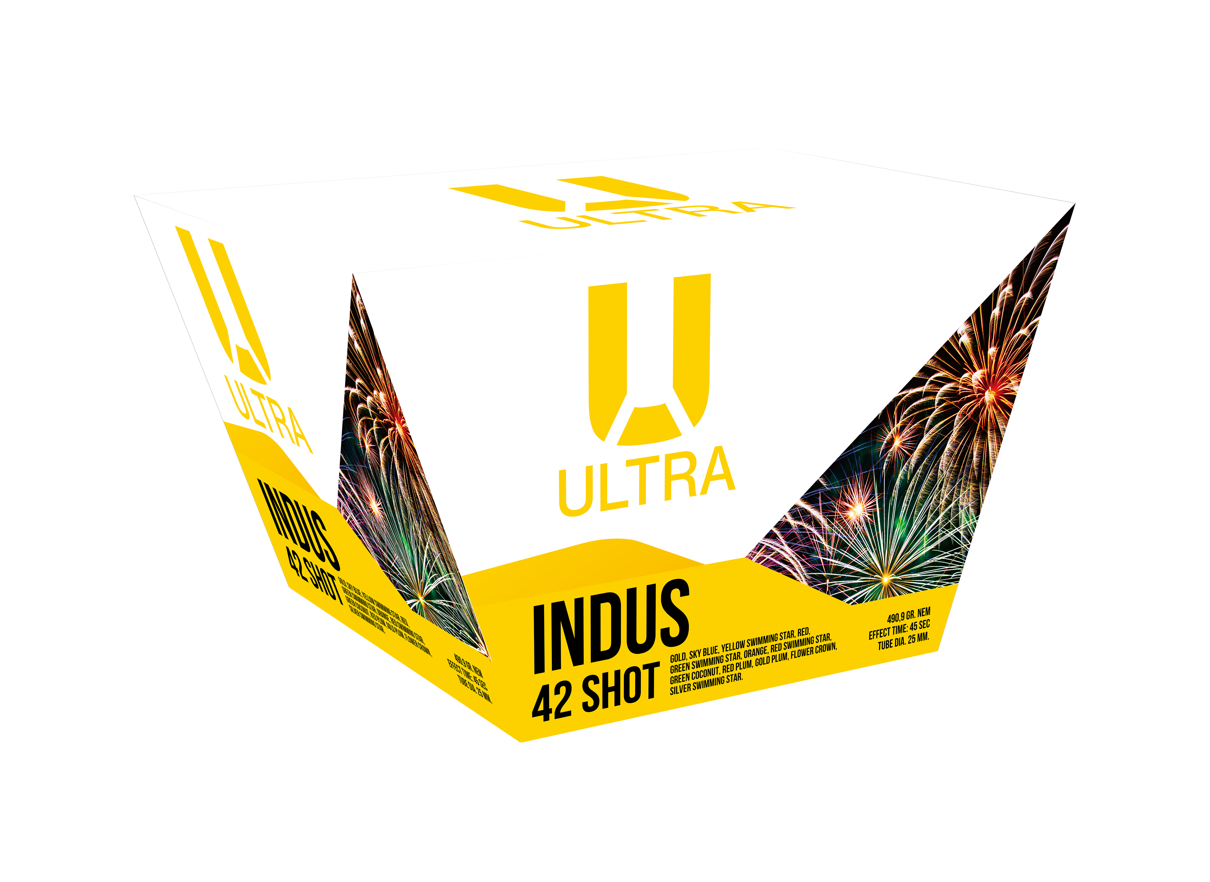 Indus fra serien Ultra er et 25 mm fest-batteri med 42 skud og 490 g krudt. Perfekt til et kraftfuldt og imponerende fyrværkerishow til nytårsaften.