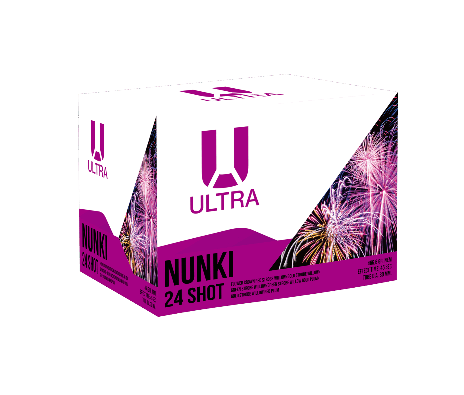 Nunki fra serien Ultra er et 30 mm kraftigt vifte-batteri med 24 skud og 466 g krudt. Perfekt til et imponerende og bredt fyrværkerishow til nytårsaften.